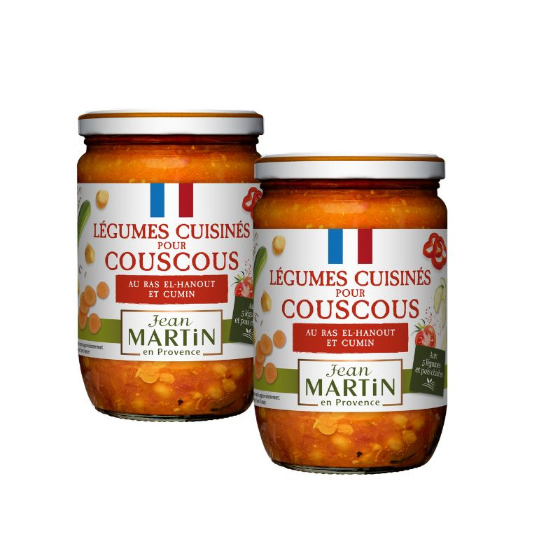 Since 1920, Jean Martin has been inventing products based on vegetables, olives, Provence and the Mediterranean. It is therefore quite natural that we created a real preparation for couscous, rich in specially selected vegetables: tomatoes, zucchini, carrots, peppers, chickpeas, cooked together and seasoned with a mixture of sweet ras el-hanout spices and fragrant.