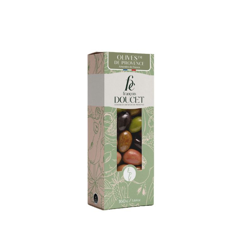 Les Olives™ de Provence sont de délicates confiseries à base d’amandes de Provence, enrobées de chocolat noir puis de chocolat blanc, teinté d’un camaïeu de verts et de noirs qui rappelle les nuances naturelles des olives.