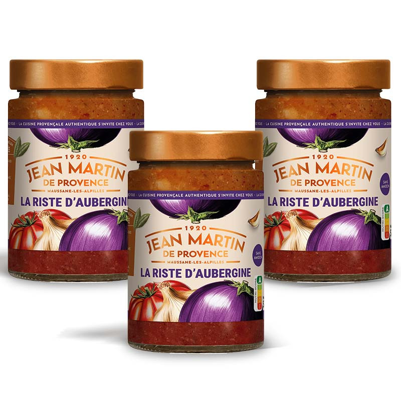 Aubergine 56%, coulis de tomate 30%, huile de tournesol, miel, sel, ail 0,6%, jus de citron concentré, sucre, huile d’olive vierge extra, thym, laurier, oignon, poivre.